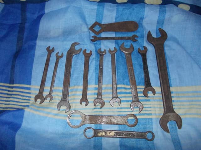 Sprzedam zestaw kluczy płaskich. W zestawie klucz płaski 1x27/25, 1x14/12, 1x16, 1x11/9, 3x12/10, 2x9/8, 2x17/14 w tym jeden oczkowy oraz dwa klucze do roweru/motoru które nie maja żadnych oznaczeń.Posiadają ślady użytkowania, naloty rdzy. 20 zł.