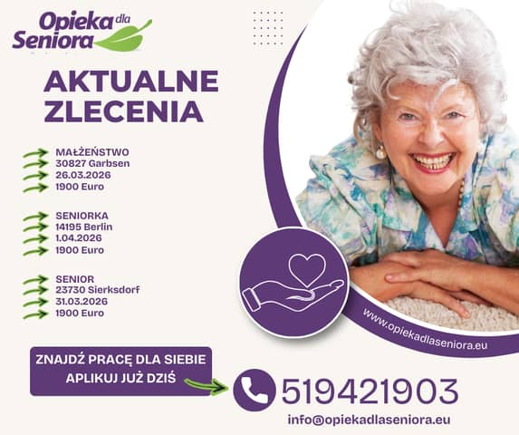 Zlecenie do Seniora 23730 Sierksdorf/ Szlezwik-Holsztyn Od 31.03.2026 do 1900 EURO + opłacony przejazd Wymagania: - mocno komunikatywna znajomość języka niemieckiego - prawo jazdy tel