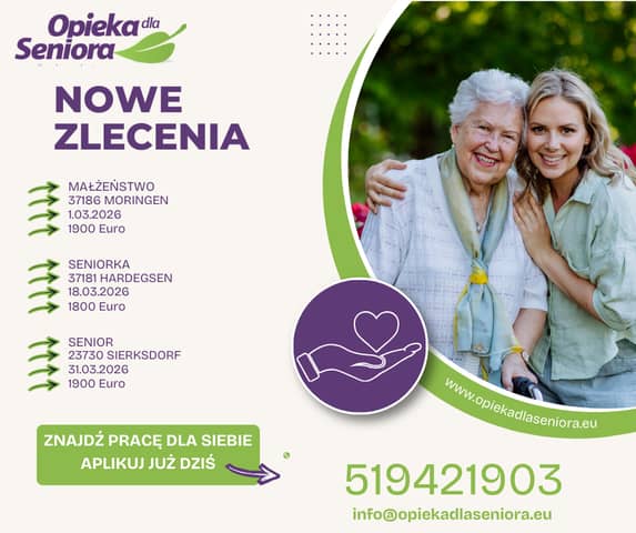 Oferta do Seniora 47638 Straelen / Nadrenia Północna-Westfalia Od 26.02.2026 Na 6 tygodni do 1900 EURO + opłacony przejazd Wymagania: komunikatywna znajomość języka niemieckiego + prawo
