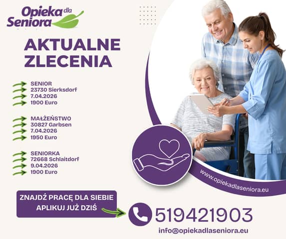 Zlecenie do Seniora 23730 Sierksdorf/ Szlezwik-Holsztyn Od 7.04.2026 Na 6 tygodni do 1900 EURO + opłacony przejazd Wymagania: - mocno komunikatywna znajomość języka niemieckiego - pr
